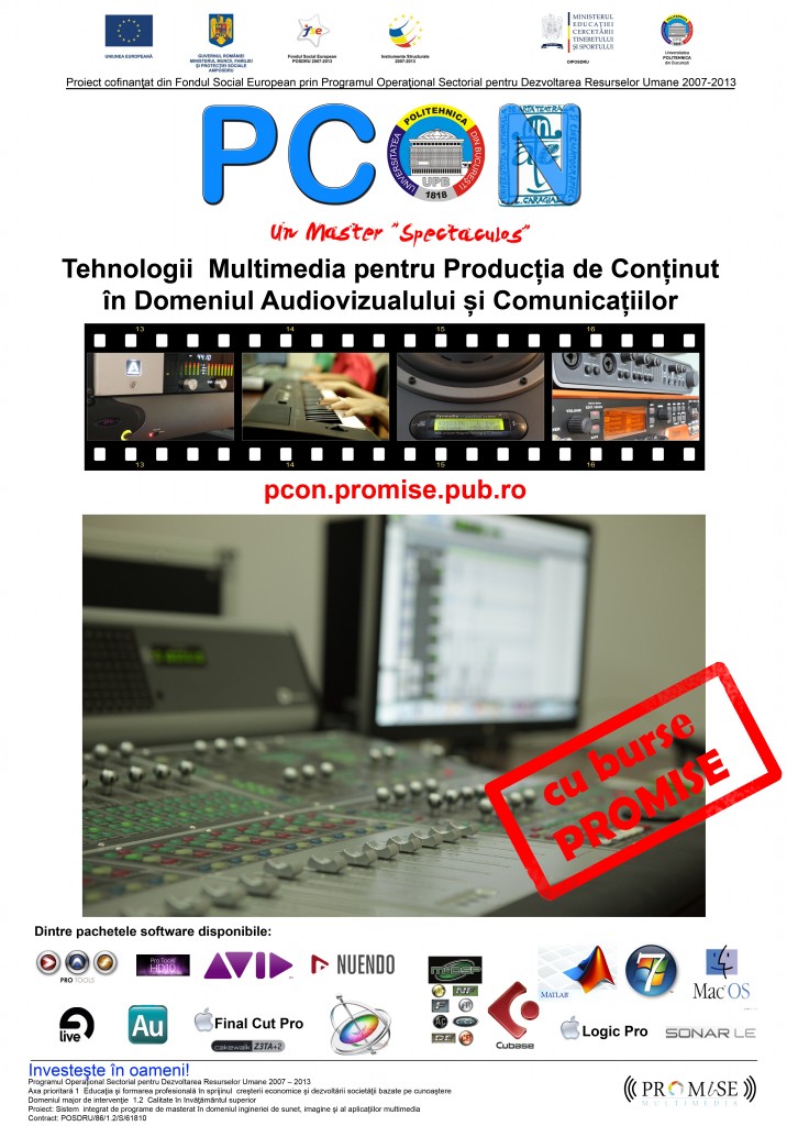 Printr-o abordare multidisciplinară, programul de studii de masterat PCON îmbină armonios în tandemul imagine şi sunet cunoştinţe de electronică, teoria sistemelor, tehnologia informaţiei, practici curente de studio film şi TV precum şi desfăşurări de evenimente multimedia complexe, oferind în ansamblu, o formare aplicată şi la nivelul tehnologiei actuale.